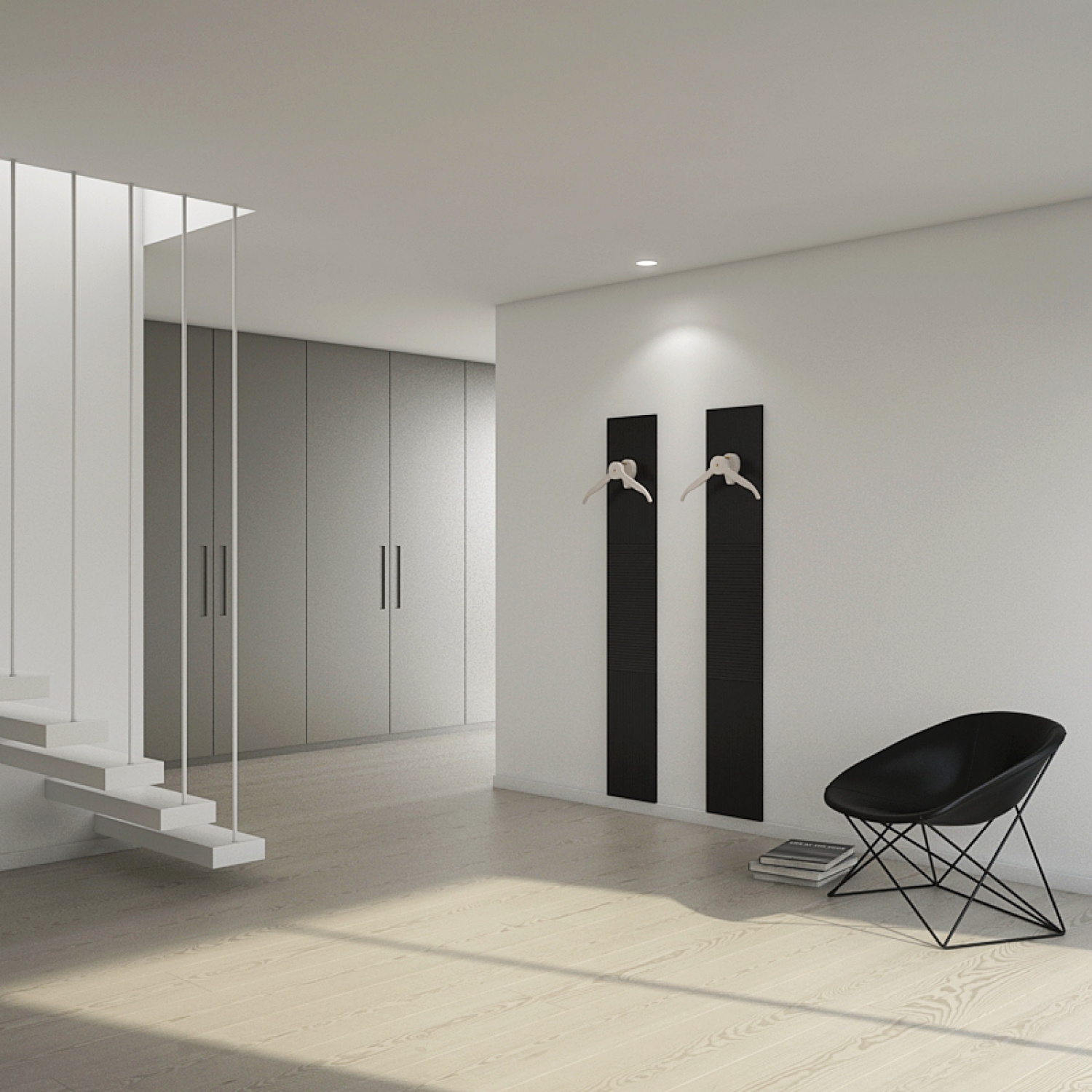 The panels are a support for the hangers, but not only: the panels have such a careful design and refined details that they can be usedas wainscoting, as a wall decoration or as an element of furnishing.