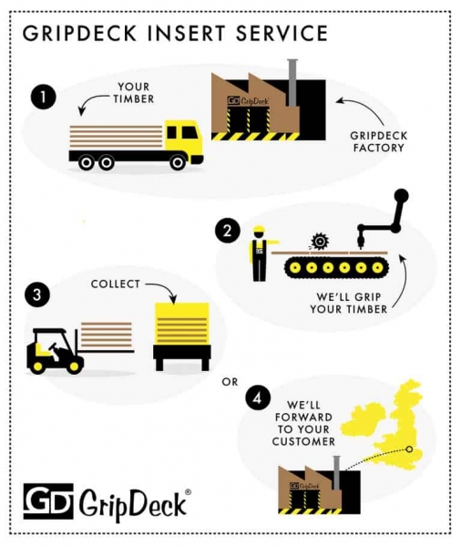 GripDeck® Decking Insert Service is a factory applied process where we bond anti-slip decking grip inserts into YOUR timber. Send in your softwood or hardwood timber to our factory and we’ll aim to turn around your order within 2-5 days.